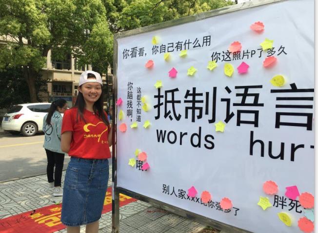 2016.4.29,由球友会官网 Sunny爱心协会主办的“[Words hurt too]抵制语言暴力我们在行动”活动在南京财经大学举办。 活动分为线上和线下两部分进行,线下外场在中苑食堂附近举办,sunny爱心协会用展板展示了用硬纸板做成的模型——拆开可拼成语言暴力的句子,组合则可变成斧子形状;同时展出的还有大型海报展板,上有前期经过网络投票选出的最具杀伤力的句子。 外场现场,许多同学站在大型海报展板前,或是仔细思考该如何将语言暴力句子改...