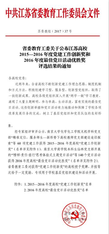2017-06-29球友会官网 党委荣获江苏省高校2015—2016年度年度党建工作创新二等奖
