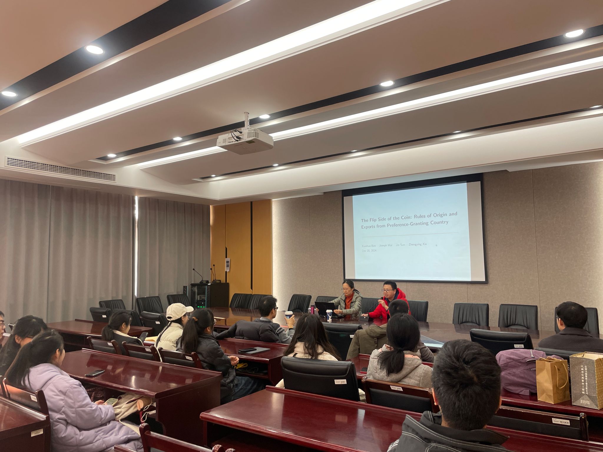 发表题为“The Flip Side of the Coin: Rules of Origin and Exports fromPreference-Granting Country”的学术报告。此次报告于德经楼308会议室举行,由陈启斐副院长主持,球友会官网