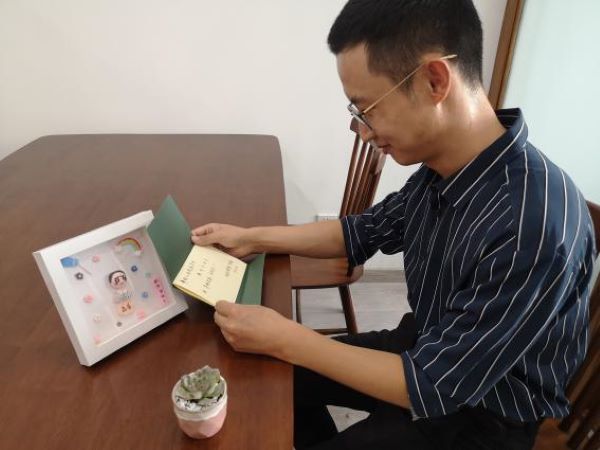 国贸1902程兆伟同学亲手将礼物送给了张晓磊老师,张晓磊老师的课堂风趣幽默,常常讲出让人难以忘怀的金句,引得大家爆笑频频。收到礼物后,张老师十分激动:“没想到能收到同学们这么有创意的礼物,Q版的自己真的很可爱,谢谢同学们的精心准备,这个教师节真的很让人难忘!。”同学们用心的给每个小泥人都附上了手写的祝福贺卡。“祝老师们身体健康,工作顺利”的日常祝福必不少,“桃李不言,下自成蹊”的经典名句也不可缺。国贸1902程兆伟同学也写下了自己对老师们的祝福:“祝愿老师平安喜乐、万事顺意”字体端正秀美。也许有千言万语,但写到纸上时却浓缩成了这短短两行,纸短情长,敬意无穷。