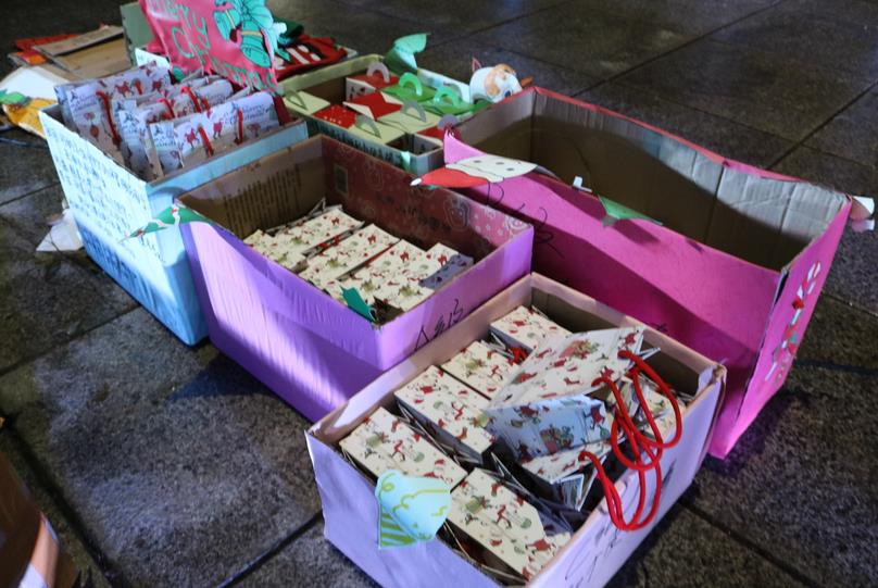 各个角落放置了一千根荧光棒,以此作为兑换不同等级礼物的筹码,提前装扮好的圣诞老人也引来同学们的踊跃合影,为活动的开始做好了充满节日气氛的前期铺垫。寒冷的天气并没有阻挡活动参与者的热情,在活动开始后不出半小时,在参与者的细心寻找下,用于兑换奖品的荧光棒就被找出。活动结束后,不同价值的礼物在兑换现场,尽数被参与者领取,传递了属于平安夜的喜悦。