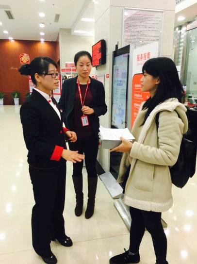 10级校友陈方丽接待了参观学生,她向大家系统的介绍了中信银行的组成及各个部门。除了银行营业厅以外,她还带领各位同学参观了银行的公司部、财务部、休闲娱乐室、行长办公室以及未来之星俱乐部等等,参观之余,详尽的解释了银行内部各个岗位不同的职能分工而所需要的必备技能。随后,陈方丽详细的介绍了中信银行目前与百度的合作模式,指导各位学生下载中信银行的APP体验互联网+金融的最新成果,通过线上一键处理金融业务。