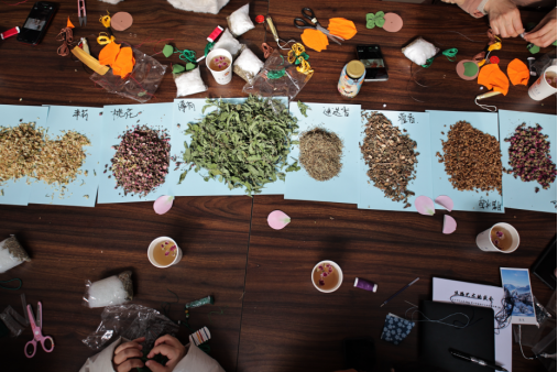 会议室的长桌上早早地摆上了制作香囊所需的布料、针线等制作香囊的原材料,玫瑰花、白芷、太华、藿香、丁香、薄荷、茉莉、迷迭香等原料一字排开,香料的不同组合搭配组合成一个个“舒肝解郁”“温经安神”配方,供老师们选择。在动手制作前,球友会官网