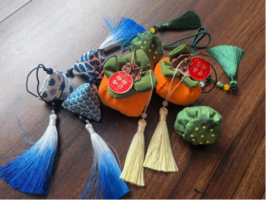 工会主席张朋朋老师为大家介绍了香囊的制作方法和香囊药方配伍。大家喝着洛神花玫瑰茶,听着悠扬婉转的音乐,感受到了“何以致叩叩,香囊系肘后”的文化内涵与艺术魅力。随后,老师们便根据自身的需求,发挥奇思妙想,在一针一线的缝制过程中,创作出一个个立体饱满、独具特色的香囊——有绿意盎然的莲蓬香囊,也有带有美好祝愿的“柿柿如意”香囊......