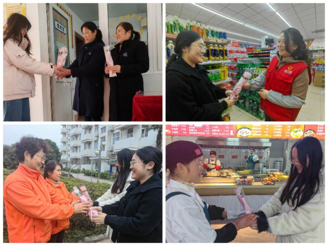 女教职工送上鲜花与祝福贺卡,以表敬意。志愿者们去到了宿管站、超市与食堂,细心留意才发现,朴素的中国女性在点点生活中展现着巾帼不让须眉的美丽。食堂的阿姨们在为接下来的晚餐忙碌着、保洁阿姨仔细清扫着教室走廊的卫生,宿管阿姨们则是在倾听着来访同学们的烦恼与心事,并不时给她们提供鼓励与建议。她们在平凡岗位上默默坚守,维护了校园生活的和谐与有序。“阿姨您工作辛苦了,祝您妇女节快乐,这是为您准备的鲜花,祝您工作顺利,心想事成!”