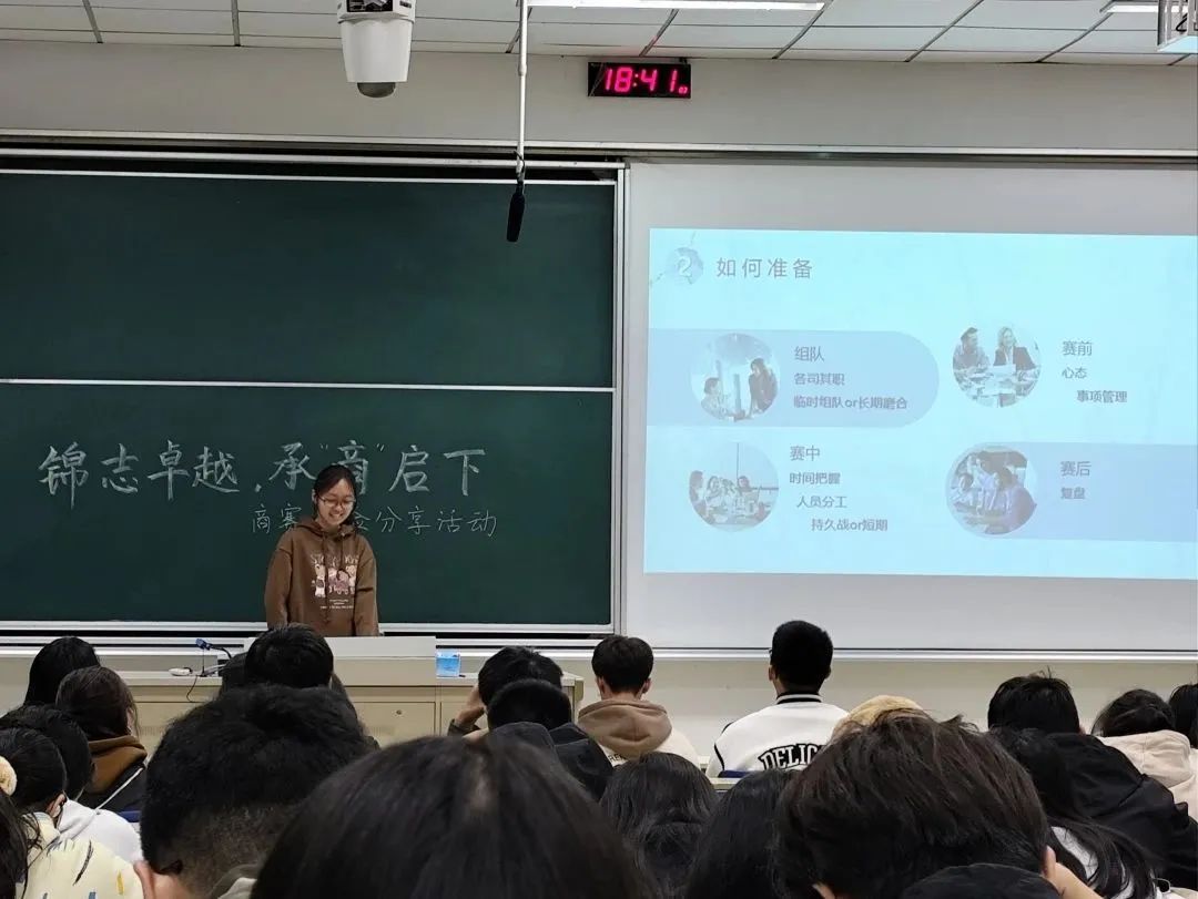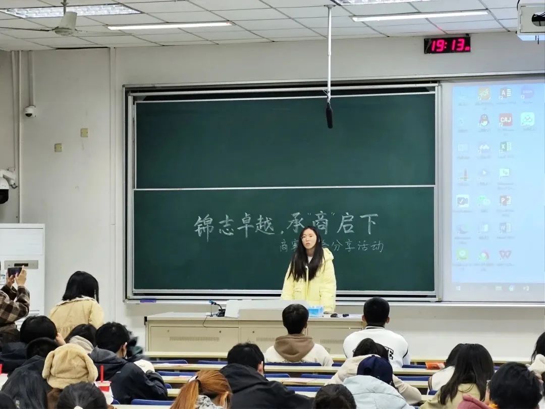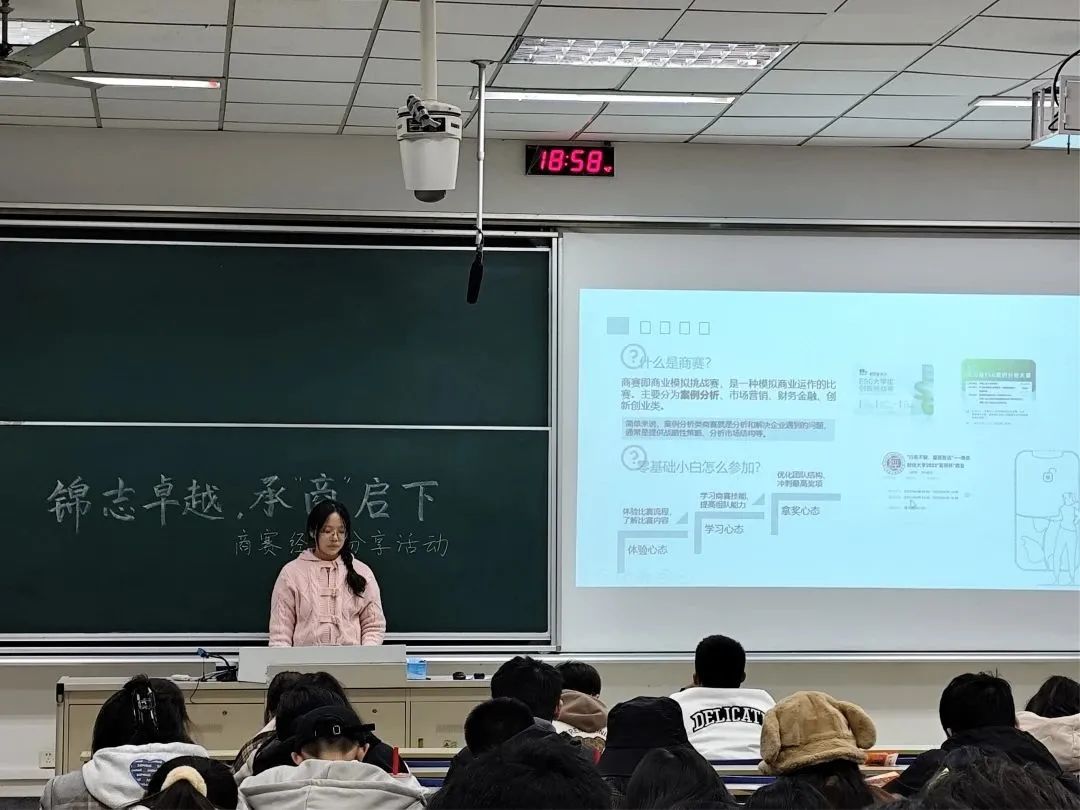 在德经楼101教室举行“锦志卓越 承‘商’启下”商赛经验分享会,此次活动邀请到了国贸2104班的陈雪子、王国磊同学,以及国贸2204李苏妍同学进行经验分享与技巧传授。