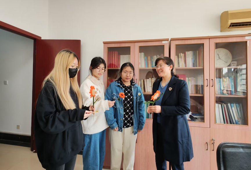 除了胸针外,同学们还使用了扭扭棒制作向日葵花束。同学们将棕色的扭扭棒盘成圆形的花盘,用橘黄色的扭扭棒折出花瓣,再用绿色的扭扭棒扭成椭圆形并连带扭出几片叶子形状当点缀,一束向日葵就制作完成了。贸经2201班的罗梓丹同学说道:“向日葵的花语是信念、光辉、温暖、勇敢,它具有所有妇女同志所拥有的美好品质,送给妇女同志们向日葵是希望她们能够像向日葵一样在生活中追寻着自己向往的光,希望她们能够勇敢的追求自己的理想。”