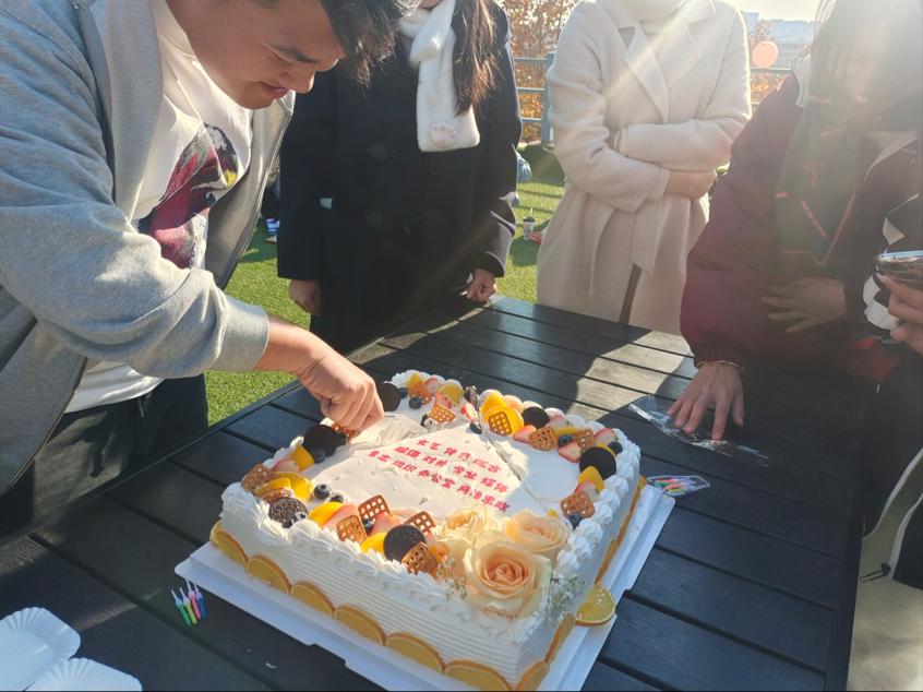 随着夕阳西下,本次活动也进入尾声,文艺部推出事先准备好的写满学生会各部门名字的蛋糕,提议借此为院会内12月份过生日的小伙伴共同庆生,火苗在大家共同的守护下成功点燃,在歌声中,在欢笑里,一齐祝愿国贸院学生会在未来越办越好!