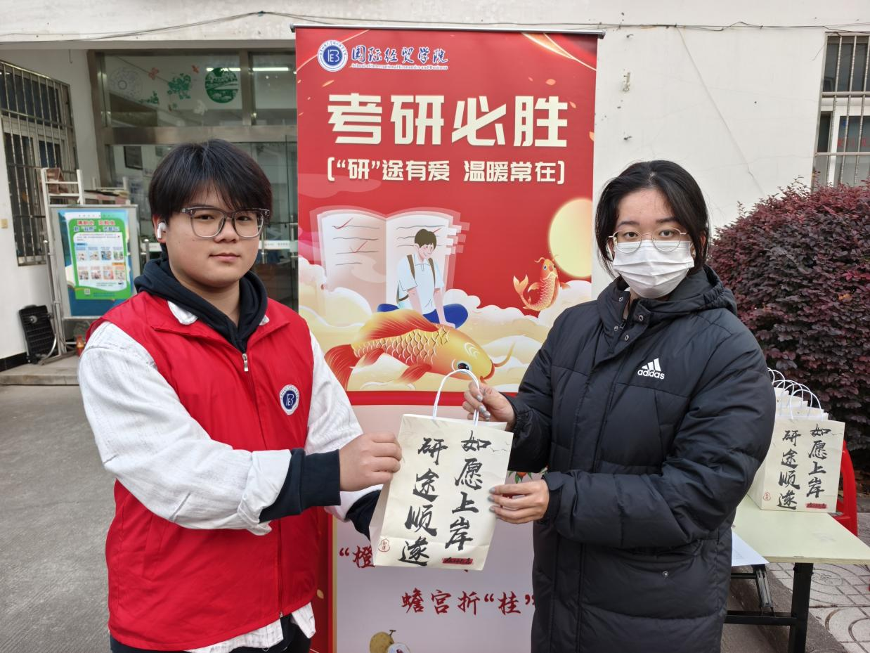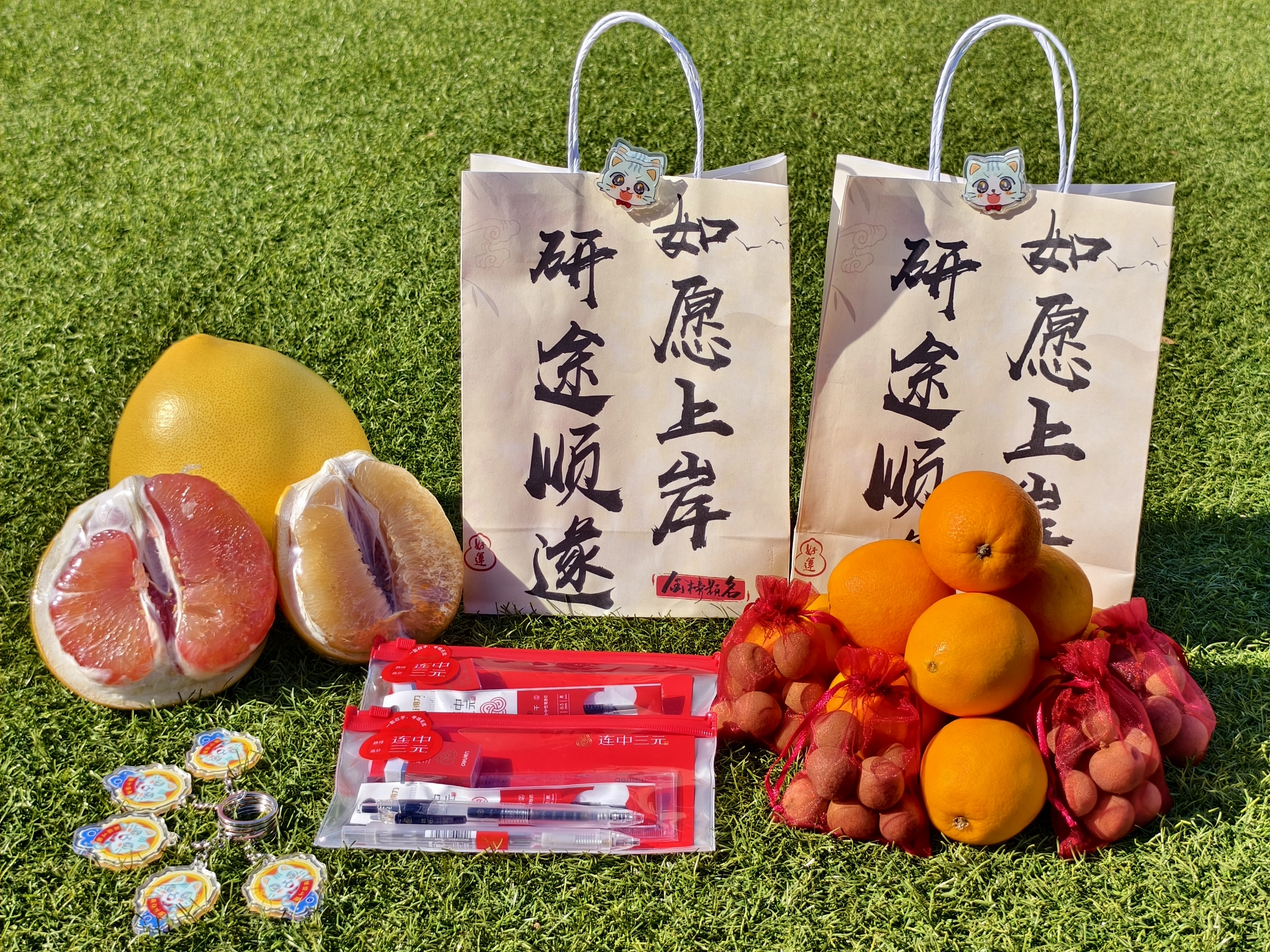 标识的定制钥匙扣寓意前程似锦,色泽鲜亮的橙子象征“成功上岸”,清甜爽口的柚子祝福“又见喜报”,果肉饱满的桂圆寄托“蟾宫折桂”的美好祝愿。从物资采购到分类打包,全程由志愿者们亲手完成,指尖传递的不仅是沉甸甸的物资,更是“薪火相传”的鼓励与守望。“接过福袋,心里暖暖的,感觉压力都减轻了一点。”国贸2204的考研同学罗光照说道。