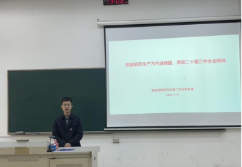 研究生第二党支部书记李贲老师于11月6日在德经楼106教室开展了一堂主题为“把握新质生产力内涵精髓,贯彻党的二十届三中全会精神”的专题党课。