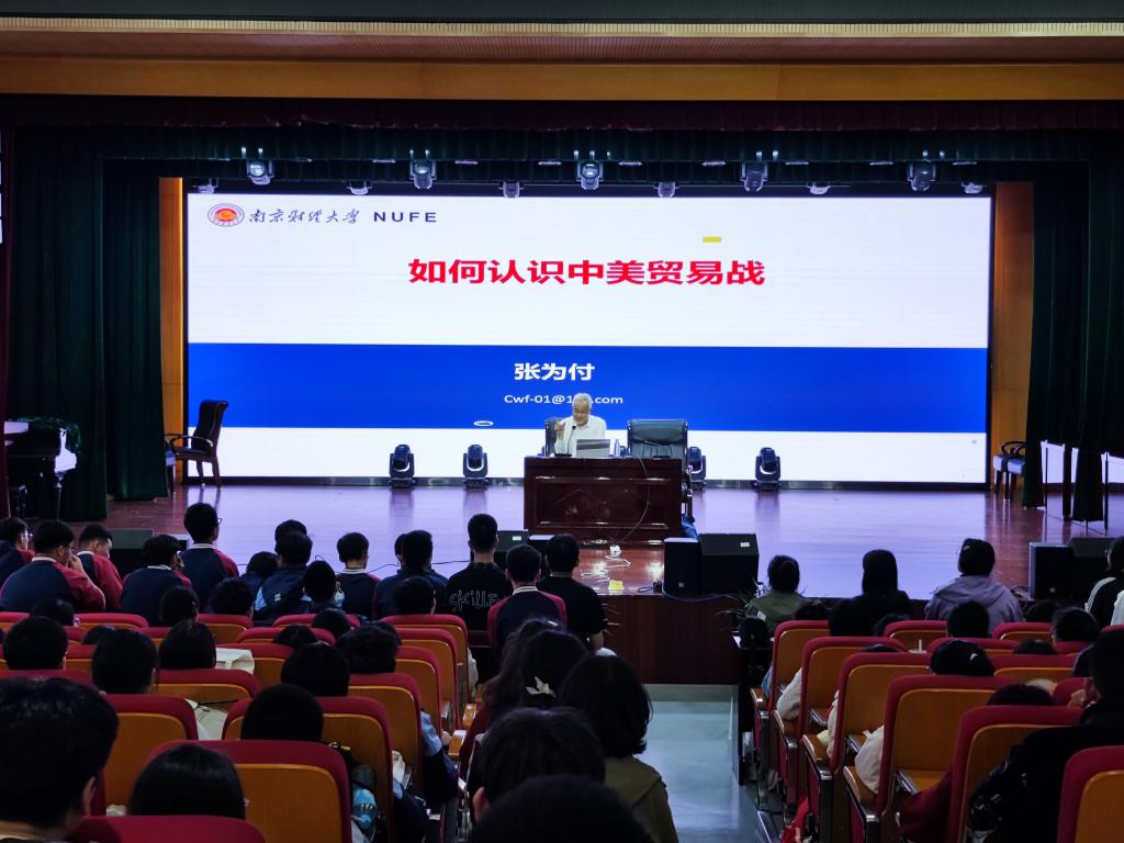 讲座由苏州高新区第一中学德育处张迎主任主持,她向在场师生介绍了张为付教授,张为付教授首先就南京财经大学的办学理念、学科特色、人才培养、历史沿革等情况进行介绍。讲座中,张为付教授结合中学阶段教授的历史、政治相关知识,以中美贸易战的导火索为切口,用专业严谨又不失风趣的语言深入浅出地剖析了国际贸易摩擦的原因和影响,在座同学聚精会神认真倾听,会场中不时传来阵阵掌声。他鼓励同学们刻苦学习,不断提高自身知识素养,成为国家未来的栋梁之才。最后,张为付教授热情邀请苏州高新区一中学子前往南京财经大学研学。