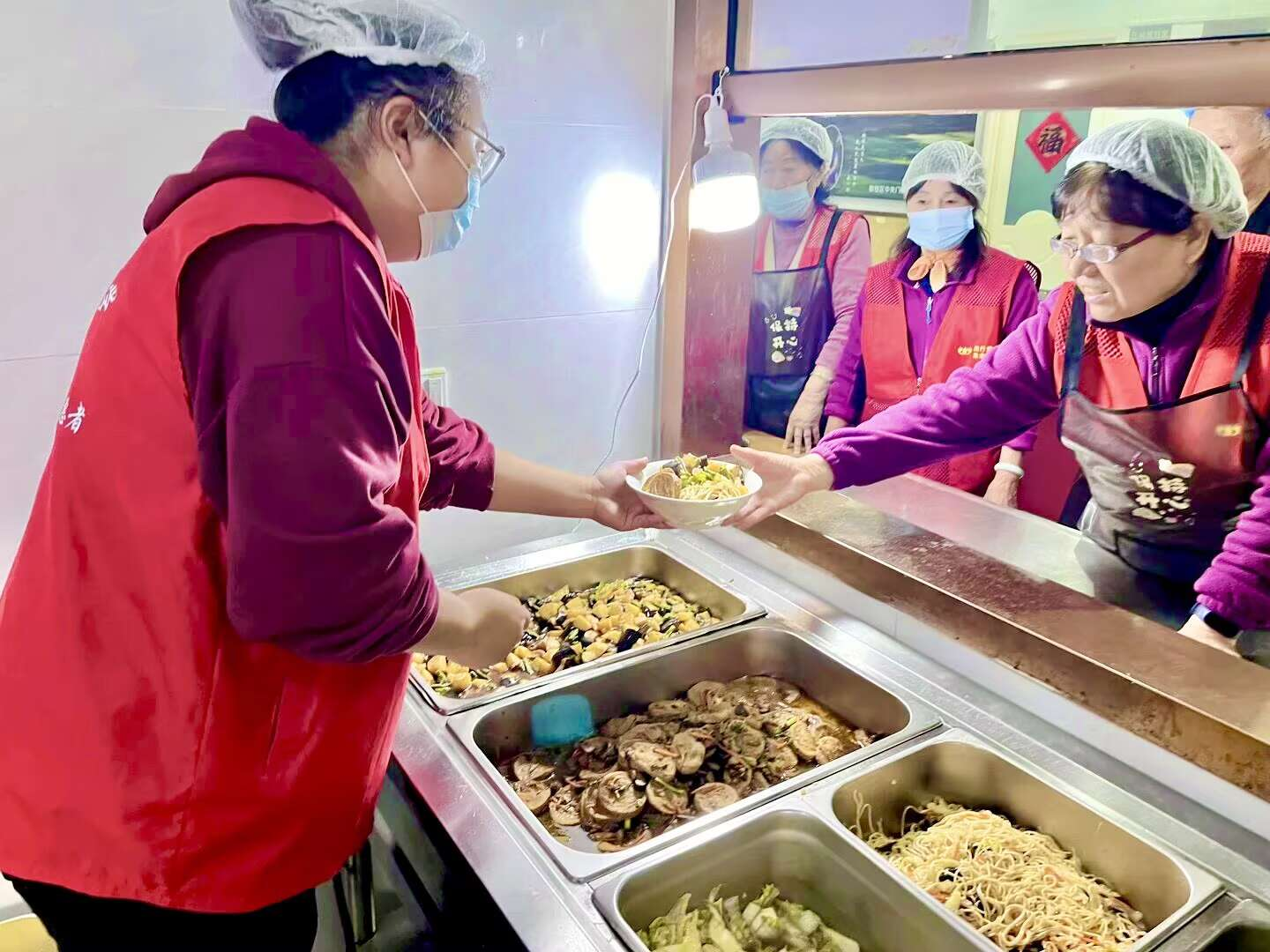 10月24日上午,老年食堂内暖意融融,热闹非凡。志愿者们身着红色志愿服,分工协作、各司其职,一组负责打扫地面、擦拭桌椅、整理餐具;另一组则进入后厨,协助工作人员洗菜、切菜、揉面。在馒头制作环节,志愿者们围在操作台前跟着食堂师傅学习技巧,经过反复揉捏、细心塑形,一个个圆润饱满的馒头整齐排列在蒸笼里。后厨内,厨具碰撞声与欢声笑语交织,整个食堂洋溢着温馨的协作氛围。