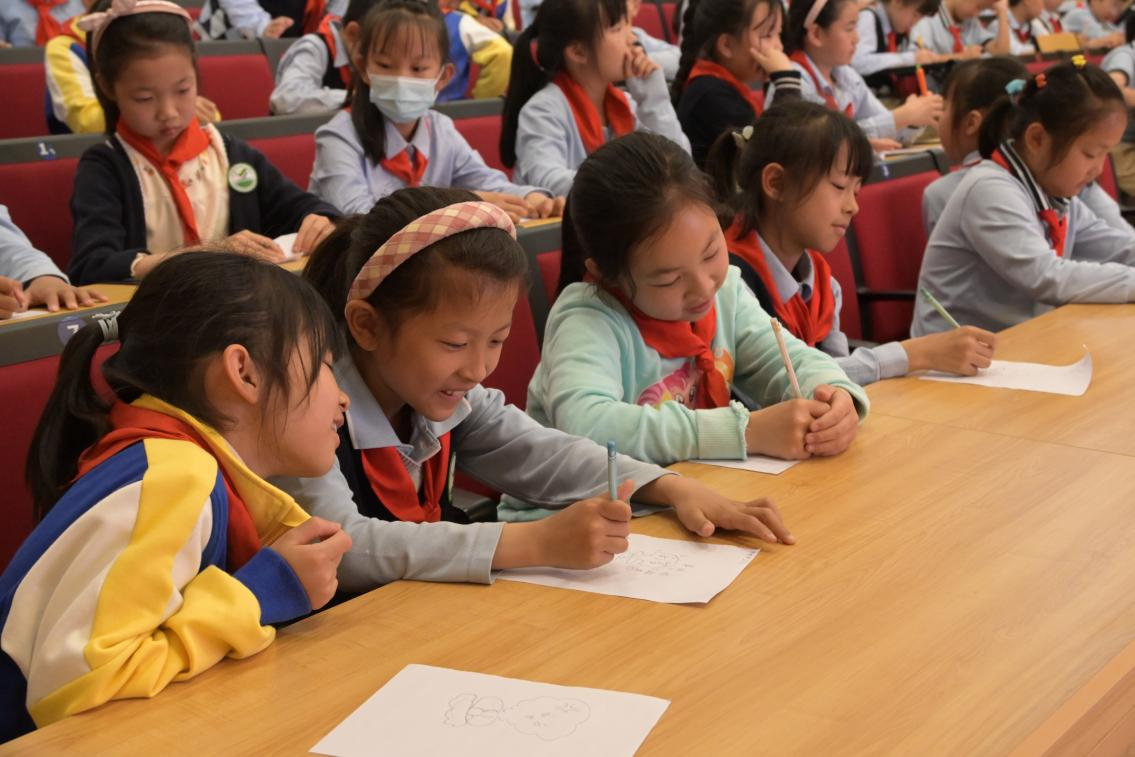 为使宣讲形式和内容更加契合小学生群体,宣讲团通过设计卡通趣味的幻灯片样式、关键节点融合动画视频展示、互动创作简笔画等形式提高学生兴趣和专注度。“两弹一星”精神宣讲结束后,同学们拿起画笔,为核弹爆炸后形成的蘑菇云设计了多样表情,并在画纸上写下对“两弹一星”元勋的感激和对未来自己的勉励。